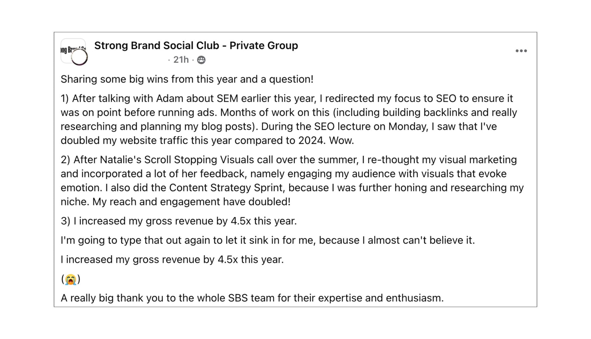 “100% I can genuinely say that joining Strong Brand Social was the missing piece that I seriously did not know that I needed to transform.”